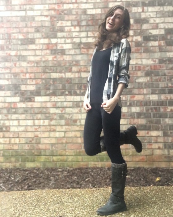 5. For my last outfit, I wanted to put together a super simple and basic outfit, since sometimes you have those days wear you don’t really need to dress up. I’ve seen renditions of this outfit online, and wanted to recreate it. I took a black top and some black leggings, and tossed in some gray flannel and boots. SO easy!