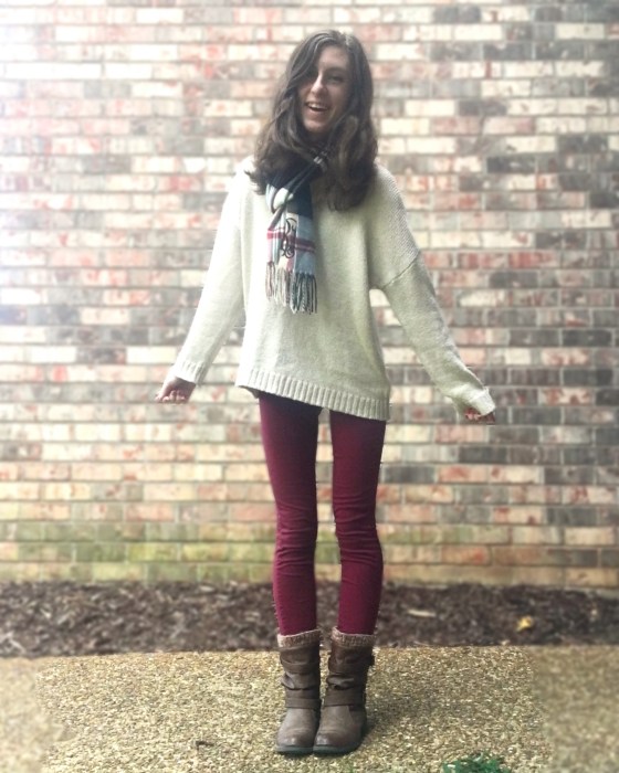 2. Talk about an easy but super cute outfit! I took a neutral sweater, paired it with some colorful jeggings, and added a matching scarf and brown boots. This is honestly one of my go-to outfits during this time of year. It’s incredibly simple, yet feels put together and fashionable.