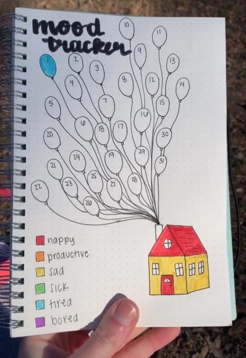 This idea of journaling is for those who like to be artistic, or even if you just like things that are visual rather than written. I’ll insert a picture so it’s a bit easier to understand, but basically, at the beginning of each month, you draw a picture of anything you like that you can draw 28-31 of (one for each day of the month). This could be literally anything: flowers, gemstones, planets, heck, even just basic shapes if you’d like! For mine, I decided to do a house with balloons, since I love the movie Up! Once you draw them, label them for each day of the month. Create a little color key for your moods: happy, sad, angry, anxious, etc. Then, each day of the month, take some time to reflect how you’re feeling that day, and color in that day’s picture with the corresponding color.